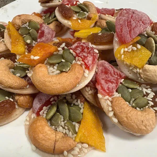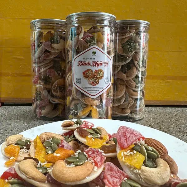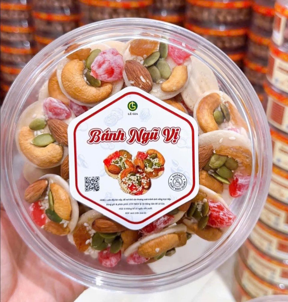 Bánh ngũ vị dinh dưỡng – kết hợp từ gạo, mạch nha, các loại hạt và trái cây sấy tự nhiên, mang đến hương vị thuần khiết và năng lượng lành mạnh mỗi ngày.