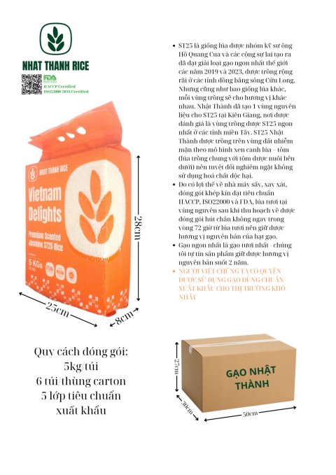 -Vùng trồng: Canh tác trên vùng lúa tôm khu vực Đồng Bằng Sông Cửu Long. - Nhận diện: Hạt gạo thon dài, thơm, có màu trắng trong, không bạc bụng. Khi nấu cơm dẻo, mềm, tơi, không bết dính, hương thơm nhẹ, vị ngọt thanh khi nhai lâu và kĩ, không bị khô cứng khi để nguội. - Hàm lượng dinh dưỡng cao: Hàm lượng protein trong gạo cao gấp 10 lần so với hạt gạo thông thường.  Hỗ trợ xương khớp chắc khỏe (15%Magie trong 200g gạo ST25), Hỗ trợ tiêu hóa khỏe mạnh (hàm lượng chất xơ cao), Tốt cho hệ thần kinh (vitamin B, Kali và vitamin E), Giảm nguy cơ mắc bệnh tiểu đường (Low GI – Lượng đường thấp). - Chất lượng: Không đấu trộn, không hương liệu tẩy trắng, không chất bảo quản chống mối mọt, không chất kích thích tăng trưởng, không thuốc trừ sâu và phân bón hóa học (gạo sạch 100% đạt chuẩn hữu cơ). - Đạt tiêu chuẩn xuất khẩu quốc tế: HACCP, ISO22000 và FDA - Giải thưởng: được công nhận là loại gạo ngon nhất thế giới , tại cuộc thi World's Best Rice lần thứ XI do The Rice Trader tổ chức năm 2019. Năm 2020, gạo ST25 giành giải nhì tại cuộc thi "Gạo ngon nhất thế giới 2020" được tổ chức tại Mỹ.