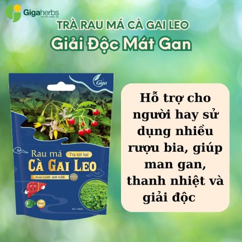 -Thành phần Mỗi túi lọc chứa : cà gai leo sạch nguyên chất, rau má - Cách dùng: Cho 1-2 gói trà túi lọc vào cốc, rót 250ml nước nóng vào, ngâm 3-5 phút, lắc đều cốc trà, nhấc gói trà lên xuống 3-5 lần cho dược tính thảo dược tan đều và thưởng thức. Ngon hơn khi pha vào ấm giữ nhiệt. - Bảo quản : Để nơi khô ráo, tránh ánh nắng trực tiếp Hạn sử dụng 2 năm kể từ ngày sản xuất Đơn vị sản xuất: Công Ty cổ phần Nông Nghiệp GiGa Herbs VIỆT NAM Chính sách: - Cam kết chất lượng và mẫu mã sản phẩm giống với hình ảnh - 1 gói 250g có 60 túi lọc