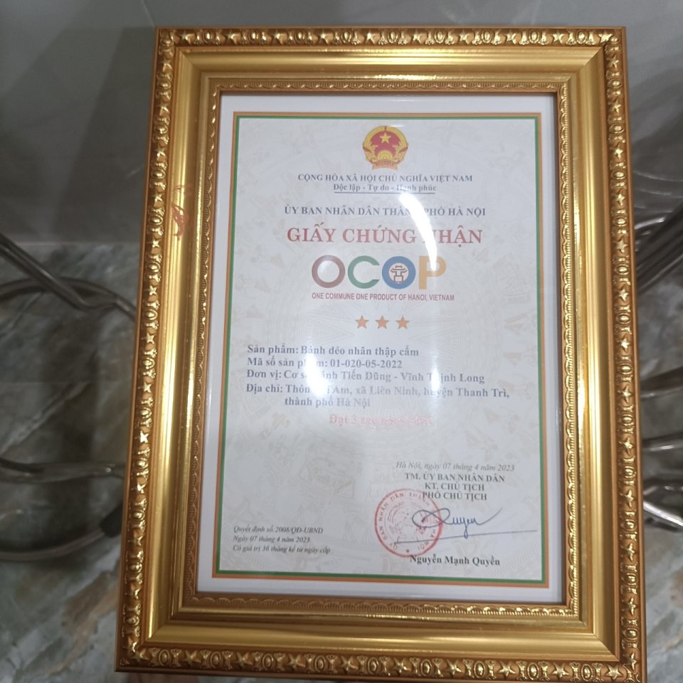 (OCOP 3 sao) 1/ Cơ sở bánh Tiến Dũng - Vĩnh Thịnh Long 2/ Địa chỉ: Thôn Nội Am, xã Liên Ninh, huyện Thanh Trì, TP Hà Nội 3/ Số điện thoại: 0984761527 4/ Người đại diện: Hoàng Văn Tươi 5/ Hình thành: Nhận thấy nhu cầu của khách hàng, với mong muốn giữ gìn phát triển tinh hoa truyền thống của cha ông để lại và vận dụng những lợi thế sẵn có Cơ sở bánh Tiến Dũng – Vĩnh Thịnh Long đem đến thị trường sản phẩm “bánh Tiến Dũng Vĩnh Thịnh” không chỉ là hương vị đậm chất truyền thống từ thời xa xưa mà còn đảm bảo về chất lượng, quy trình sản xuất từ khâu chọn nguyên liệu đến đóng gói đưa ra thị trường đảm bảo vệ sinh an toàn vệ sinh thực phẩm mang đến sự an tâm cho khách hàng khi sử dụng. Cơ sở bánh Tiến Dũng – Vĩnh Thịnh Long với sản phẩm “bánh Tiến Dũng Vĩnh Thịnh” được sản xuất theo phương thức truyền thống liên tục phát triển phát triển theo hướng cải tạo, sáng tạo, đổi mới nhưng vẫn giữ được những hương vị truyền thống của cha ông để lại. Với mong muốn đẩy mạnh phát triển sản phẩm trên thị trường trong thời gian sắp tới giúp khách hàng biết đến sản phẩm bánh nướng nhân thập cẩm của Cở sở bánh Tiến Dũng – Vĩnh Thịnh Long nói riêng và trên địa bàn huyện Thanh Trì nói chung. Đây vừa là bài toán kinh tế giúp bà con nơi đây có công ăn việc làm ổn định vừa đẩy mạnh phát triển đóng góp kinh tế của địa phương.