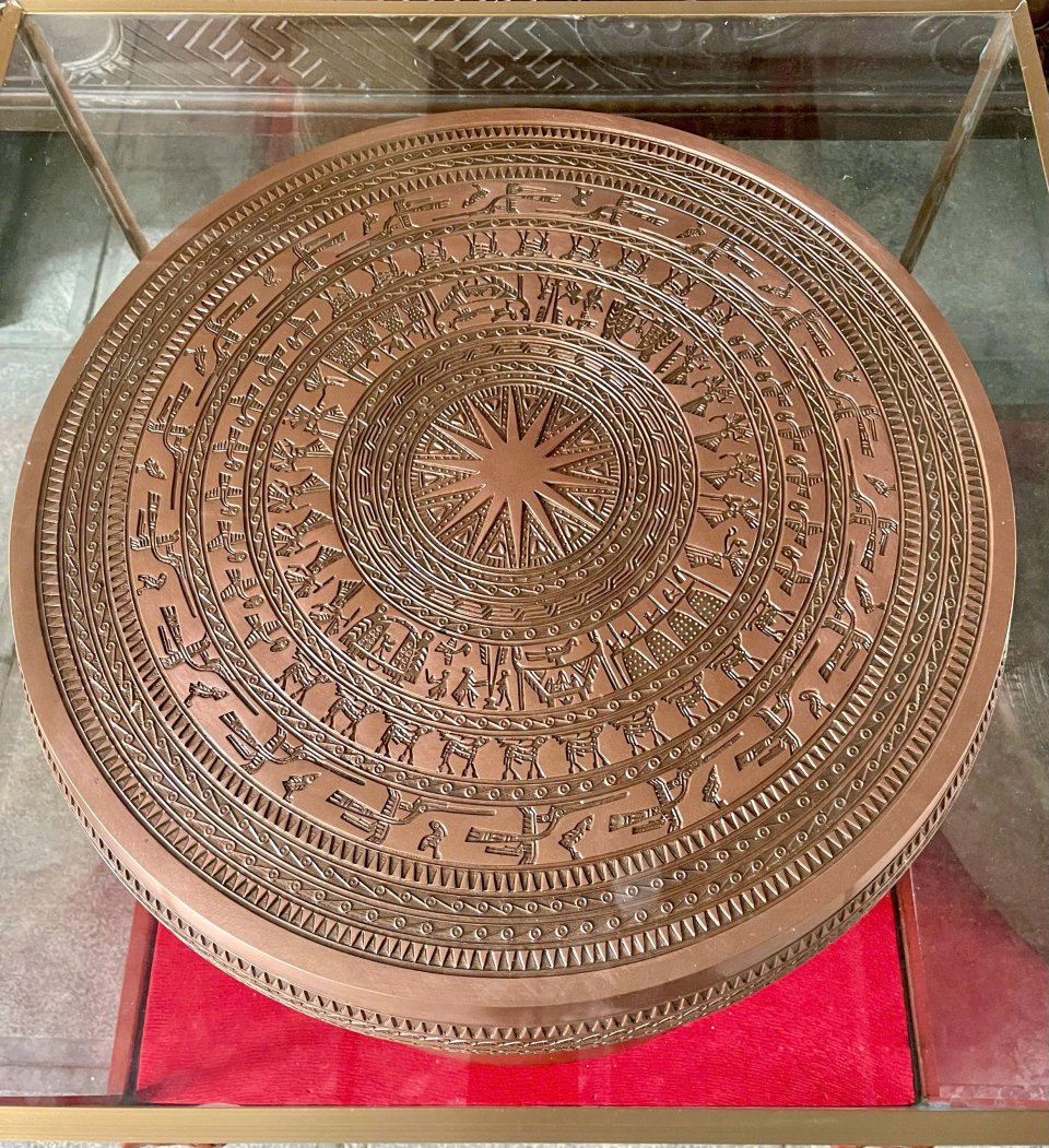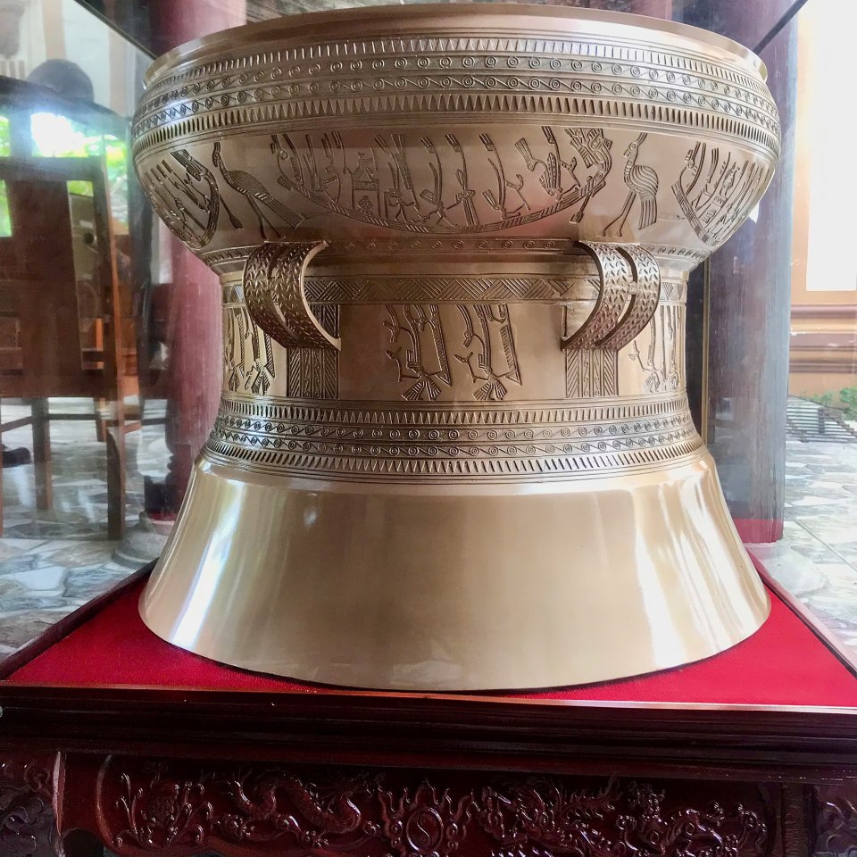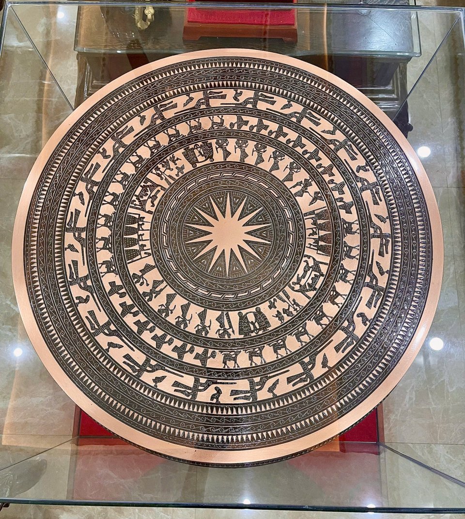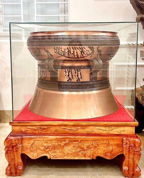 - Chất liệu: được đúc đồng đỏ loại 1 nguyên khối. - Kích thước: đường kính bề mặt 40cm, cao 32cm, độ dày của trống từ 3mm đến 4mm. - Trọng lượng: 20kg - Màu sắc: nguyên bản đồng đỏ - Hình thức: Đúc theo hoa văn mặt trống đồng Ngọc Lũ - Chi tiết:Giữa mặt trống đồng đức nổi hình mặt trời 14 tiea, xung quanh khắc những hoa văn chủ đề. - Thời hạn sử dụng: Lâu dài